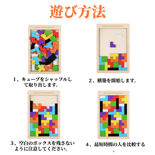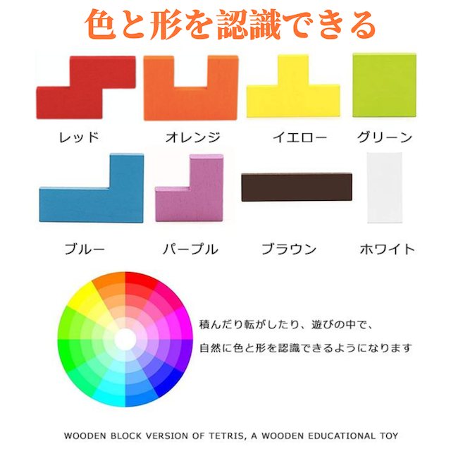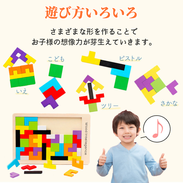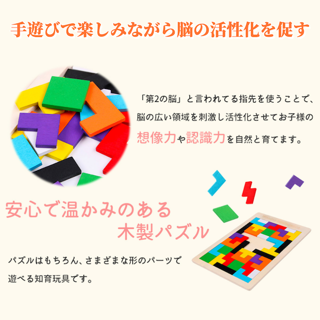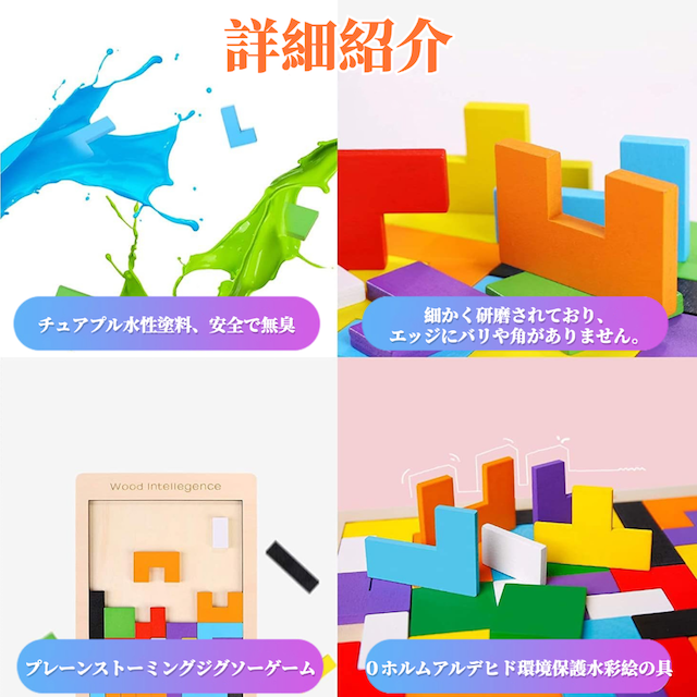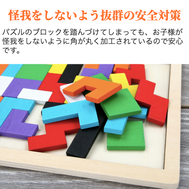 楽しく遊びながら、お子様の発想力や思考判断力、図形の認識力などを養うことができます。 万が一お子様がピースを口に入れてしまっても、無害な水性塗料を使用しておりますので安心、安全です。