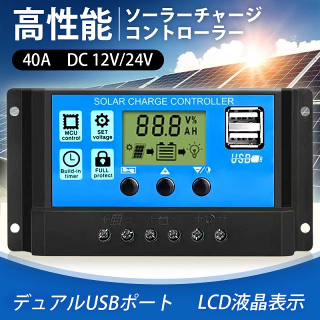 ソーラーチャージコントローラー 40A ソーラーチャージャー 液晶画面 太陽光発電 ソーラーパネル バッテリー 12V 24V 兼用 リチウム 鉛蓄 電池 USB5V出力ポート