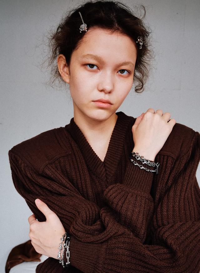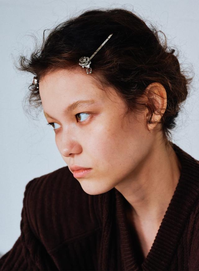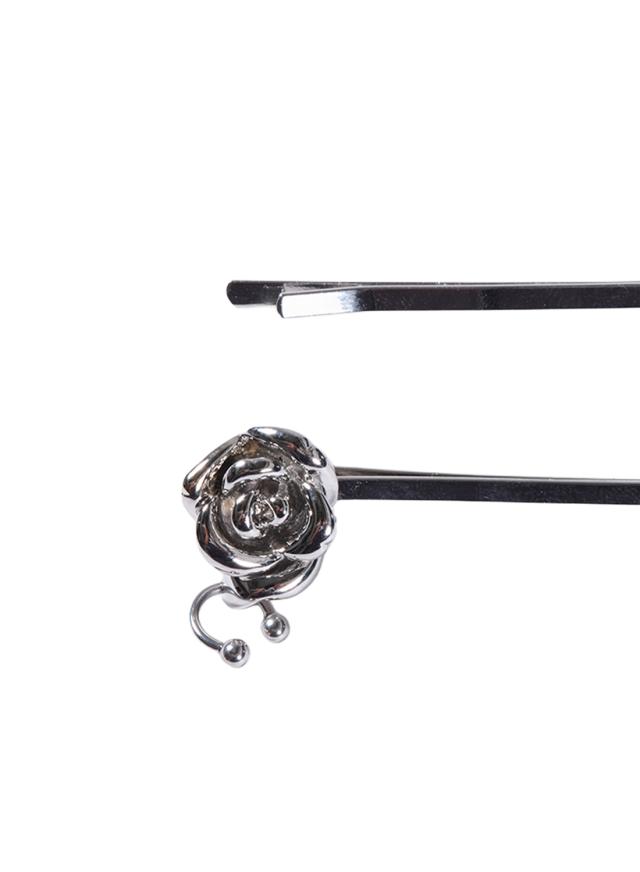細身のメタルピンに小さなバラのフォルムがアクセントとなり、甘すぎずモードな雰囲気を演出。