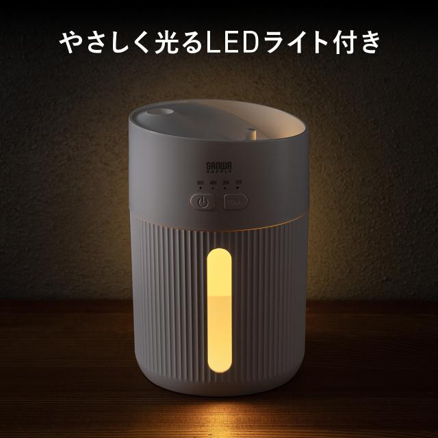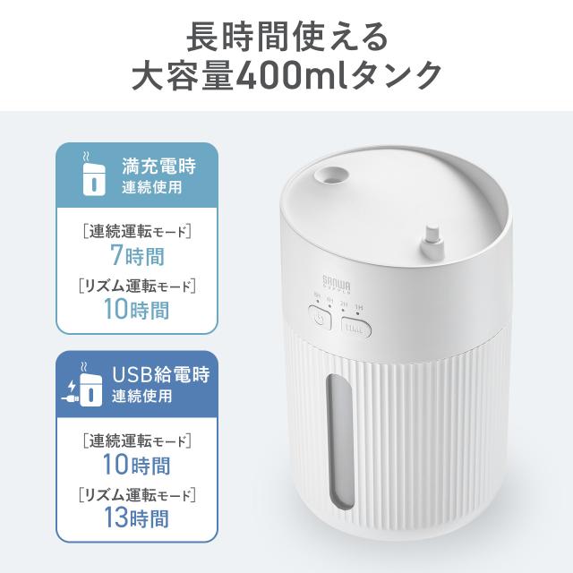 加湿器 卓上 超音波式 上部給水 バッテリー式 USB充電 400ml 水漏れ防止 タイマー付き 静音 小型 LEDライト オフィス 寝室 上から給水 ホワイト[400-TOY051W]