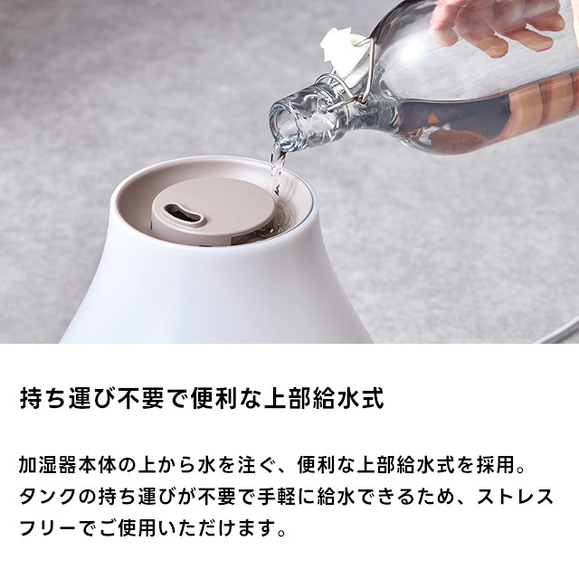 お部屋にやわらかな印象を与える、雫のような曲線のフォルムが魅力のハイブリッド式加湿器。