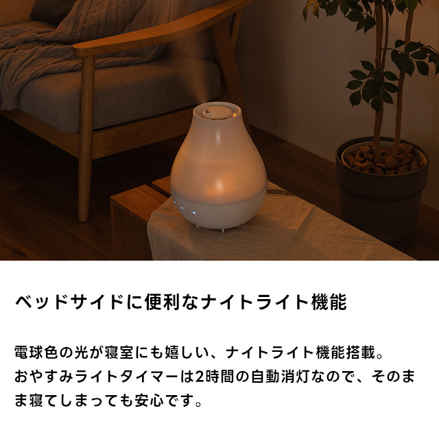 ナイトライト機能を搭載し、電球色の光がベッドサイドを優しく照らします。