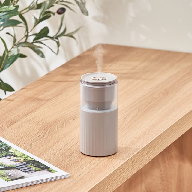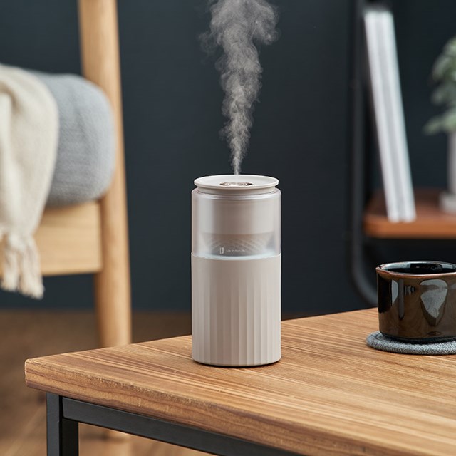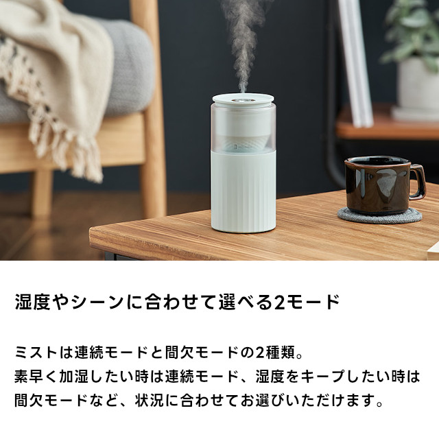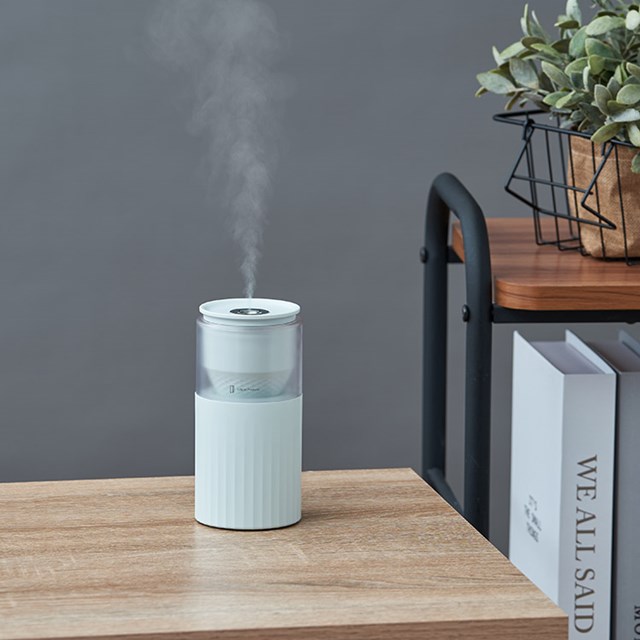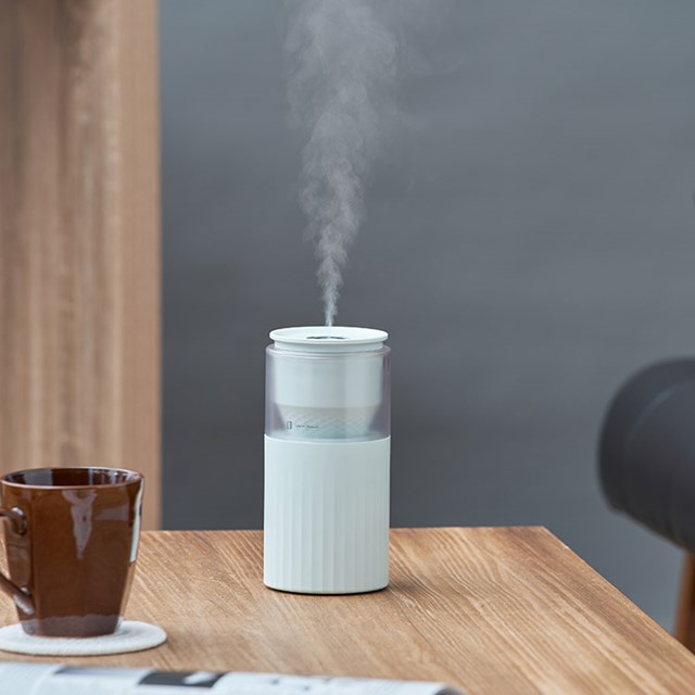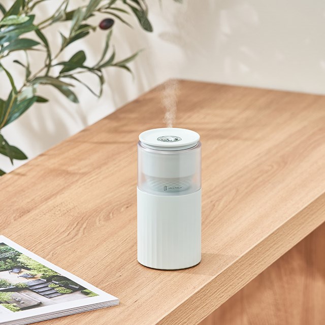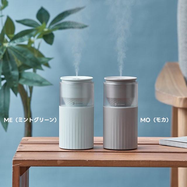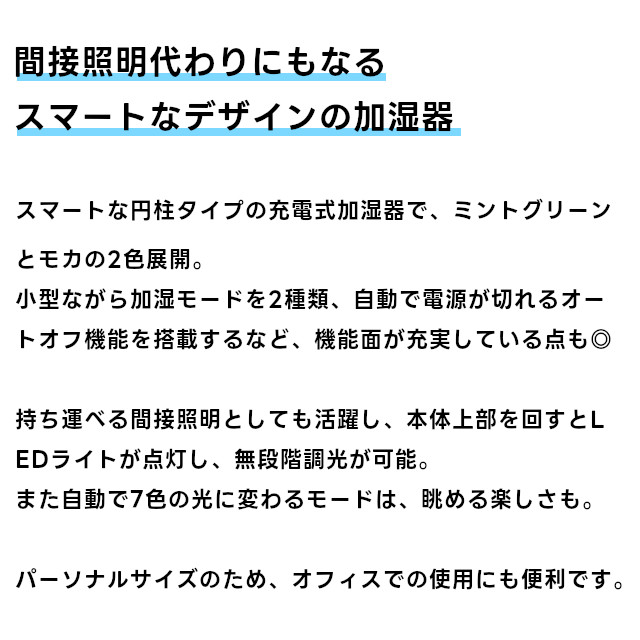 スマートな円柱タイプの充電式加湿器で、ミントグリーンとモカの2色展開。