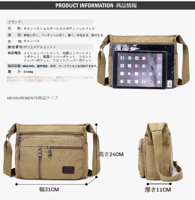 メンズ キャンバス ショルダーバッグ 韓国風 大容量 斜めがけ アウトドア 旅行 カジュアル バッグ 洗える 通勤 通学