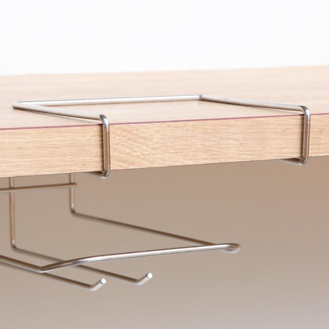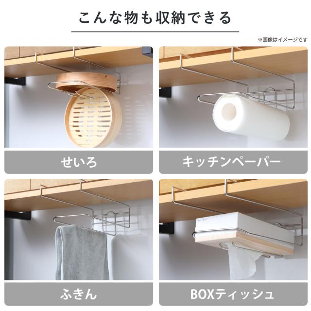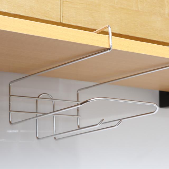 工具不要で吊戸棚の棚板に掛けるだけで簡単に取り付けることができます。吊戸棚や食器棚のデッドスペースを収納スペースとして活用できるのも嬉しいポイントです。