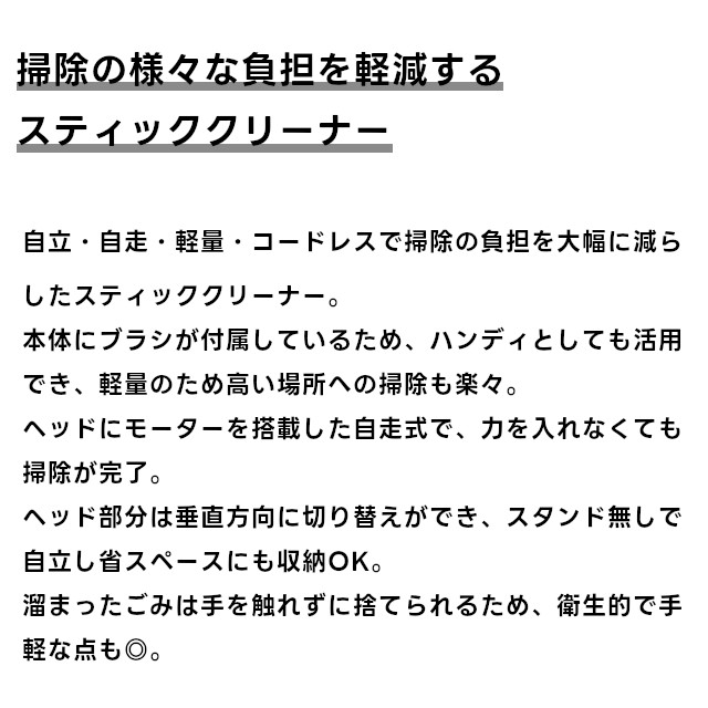 自立・自走・軽量・コードレスで掃除の負担を大幅に減らしたスティッククリーナー。