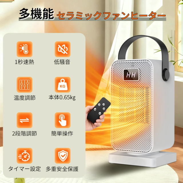 ラミックヒーター 小型 速暖 二段階風量 12時間タイマー 過熱保護 知能恒温 転倒オフ リモコン オフィス 寝室 台所