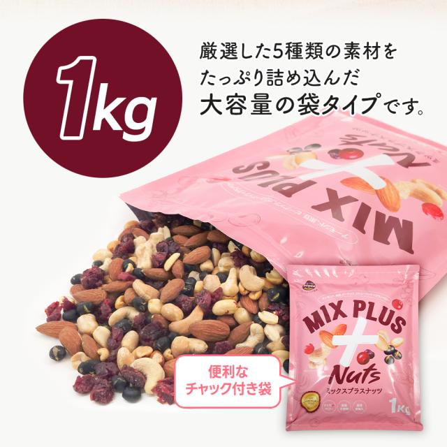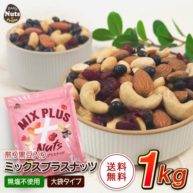 ミックスプラスナッツ 1kg 5種ミックスナッツ アーモンド 黒豆 ハイオレイックピーナッツ カシューナッツ クランベリー 落花生 素焼き 無塩 産地直輸入 アルミチャック付き袋 防災食品 非常食 常備食