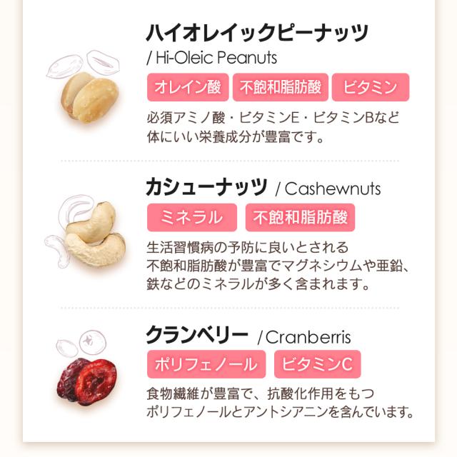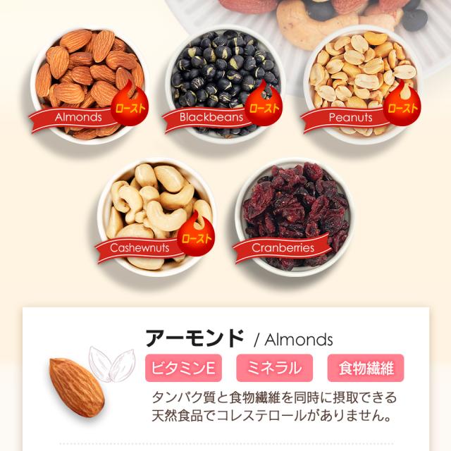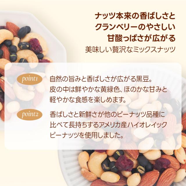 | 原材料名 | アーモンド(アメリカ産)、黒豆、落花生、カシューナッツ、乾燥クランベリー(クランベリー、砂糖、植物油脂) |