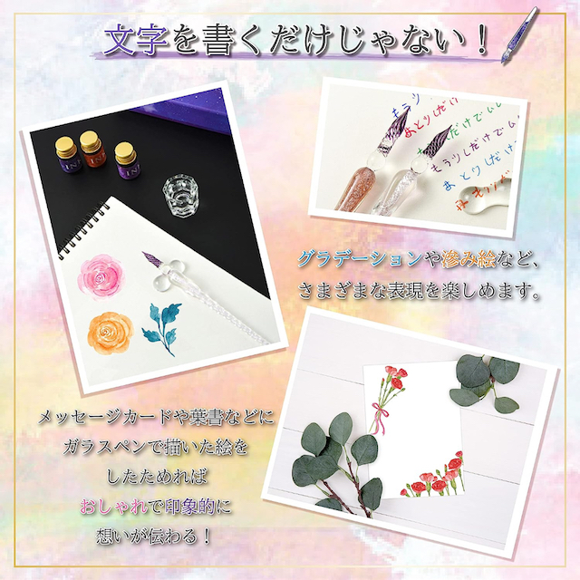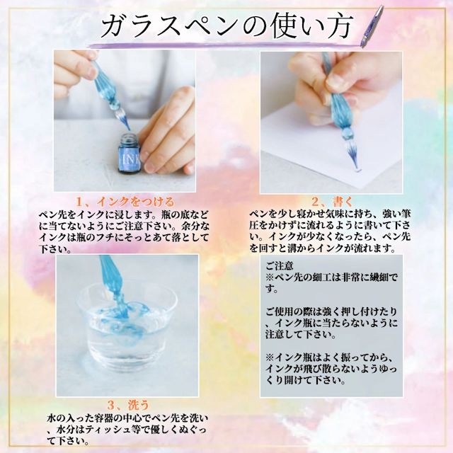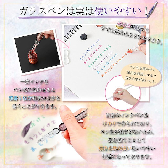 | 商品説明 | 【初心者のためのデビューセット】 ガラスペンをこれから始めたい人向け。このセットひとつでOK。 自分用としてもギフトとしても喜ばれること間違いなし。この素晴らしいガラスペンは使いやすく、書道のさまざまなニーズに最適です。 【高品質素材使用】 スパイラルペン先は、高ホウケイ酸材料と耐熱ガラスで作られており、インクの吸着を増やし、書き込み時間を延長するように設計されています。 また、不純物が少ないほどペンのキラキラ感が増すので、職人技が最大限に発揮できるのは職人の能力です。 【12色のインク付き】 ガラスペンの使い方は簡単で、初心者にぴったりです。超微粒子のゴールドパウダーを含むマルチカラーインクが付属していますが、体験感はとても奇妙ですので、使用前に十分に均一に振ってください。 【滑らかで多用途】 直線状の溝のあるペン先を備えたこのガラスペンは、滑らかな筆記のためのスムーズなインクの流れが可能し、短いエッセイの書き込み、ゲストブックへのサイン、描画とスケッチ、手書きのレタリング、書道の練習に適しています。 【最高のプレゼント】 ガラスディップペンは自分用や友達家族にもぴったりです!友達の誕生日や夫婦記念日には、プレゼントとしてあげることができ、優雅で雰囲気があります。 【パッケージ内容】 ガラスペンx2本 クリーニングカップx1個 ペンホルダーx1個 インクボトルx12個 ガラスペンの使い方: 1、インクをつける ペン先をインクに浸します。瓶の底などに当てないようにご注意下さい。余分なインクは瓶のフチにそっとあて落として下さい。 2、書く ペンを少し寝かせ気味に持ち、強い筆圧をかけずに流れるように書いて下さい。インクが少なくなったら、ペン先を回すと溝からインクが流れます。 3、洗う 水の入った容器の中心でペン先を洗い、水分はティッシュ等で優しくぬぐって下さい。 ご注意事項: ※ペン先の細工は非常に繊細です。 ご使用の際は強く押し付けたり、インク瓶に当たらないように注意して下さい。 ※インク瓶はよく振ってから、インクが飛び散らないようゆっくり開けて下さい。 ※インクカラーはランダムで選ばせて頂きますのでご了承下さい。(インクカラー選択することできません) |