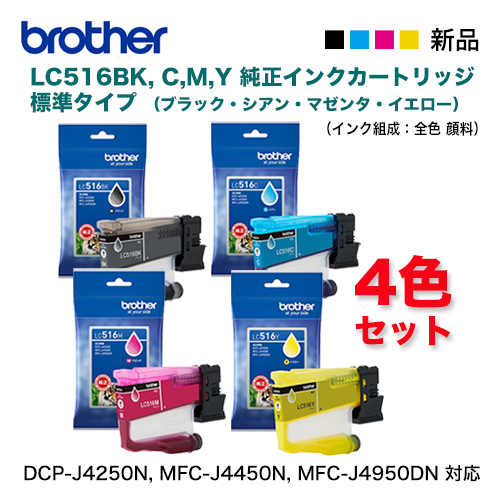 ※ネコポス便※【標準タイプ 4色セット】 brother/ブラザー工業 LC516BK, C, M, Y (黒・青・赤・黄) インクカートリッジ 純正品 新品 (DCP-J4250N, MFC-J4450N, MFC-J4950DN 対応) 【代引決済不可】