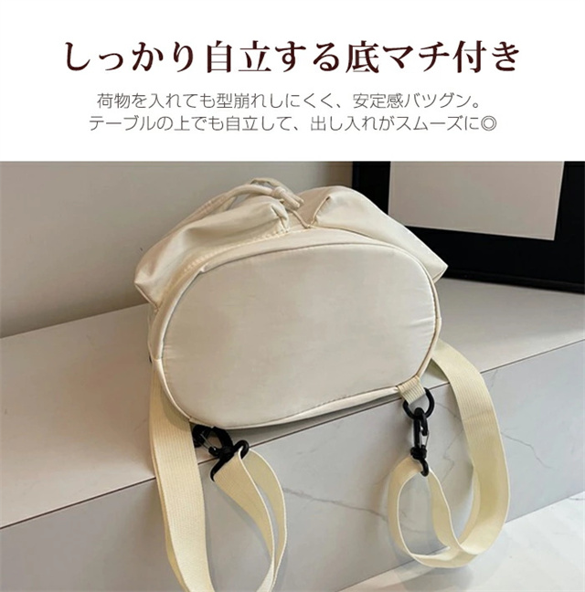 | 特徴 | 毎日のコーデに合わせて使える、 軽量ナイロン素材の巾着型3WAYバッグです。 ショルダーバッグ/トートバッグ/リュックの3WAY仕様で、 手提げ・肩掛け・斜めがけなど、シーンに合わせてスタイル自在。 程よい光沢のナイロン風素材を採用し、 軽くて持ちやすく、防水・撥水加工で雨の日も安心。 デイリー使いはもちろん、旅行やマザーズバッグとしても活躍します。 内側・外側に便利なポケット付きで収納力抜群。 A5サイズ書類や折りたたみ傘、ポーチ、スマホなど、 必要なものをすっきり整理できます。 カジュアルながら上品なデザインで、 大人女子にもぴったりなおしゃれな巾着ショルダー。 グレージュ/ブラック/アイボリーなど、落ち着いたカラー展開で 通勤・通学・おでかけ・旅行など幅広いシーンにマッチします。 軽量&大容量のレディースバッグとして、 サブバッグやトレンドアイテムにもおすすめ。 これひとつで「かわいい」も「機能性」も叶える、万能バッグです。 |