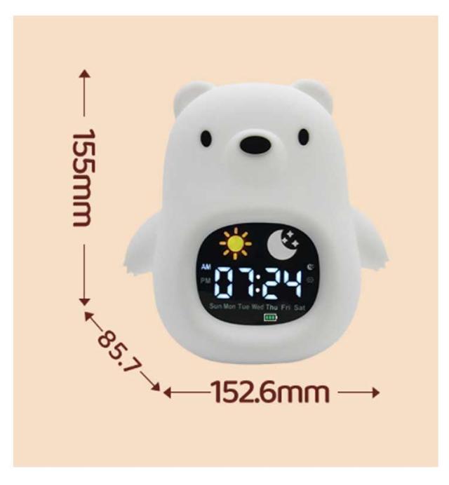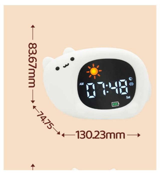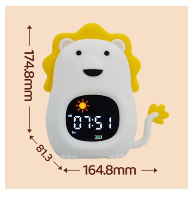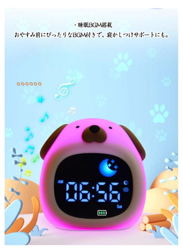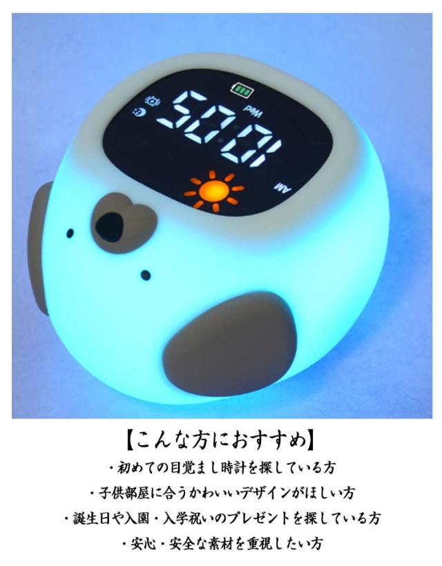 | ライト付き 音量調整機能 シリコン製 こどもの“はじめて”目覚まし時計 10タイプ 睡眠BGM搭載 はじめての目覚ましにぴったり! かわいい動物デザインのキッズアラームクロック お子さまの「ひとりで起きる」を応援する、やさしい光と音の子供用目覚まし時計です。 くま・いぬ・ねこ・きょうりゅうなどの全10タイプから選べて、お部屋のインテリアとしても◎ 【おすすめポイント】 ・ ナイトライト機能付き やさしい光が夜のおともに。 暗がりが苦手なお子さまも安心して眠れます。 グラデーションで色が変化し、好きな色で固定も可能です。 ・ぷにぷに柔らかいシリコン素材 本体はシリコン製でやわらかく、落としても壊れにくい安心設計。 小さなお子さまにもやさしい触り心地。 ・ライト付き・音量調整機能あり 起きやすい音量に調整できるので、音が苦手なお子さまでも安心。 LEDライトで時間もくっきり表示。 ・睡眠BGM搭載 おやすみ前にぴったりなBGM付きで、寝かしつけサポートにも。 【こんな方におすすめ】 ・初めての目覚まし時計を探している方 ・子供部屋に合うかわいいデザインがほしい方 ・誕生日や入園・入学祝いのプレゼントを探している方 ・安心・安全な素材を重視したい方 | |