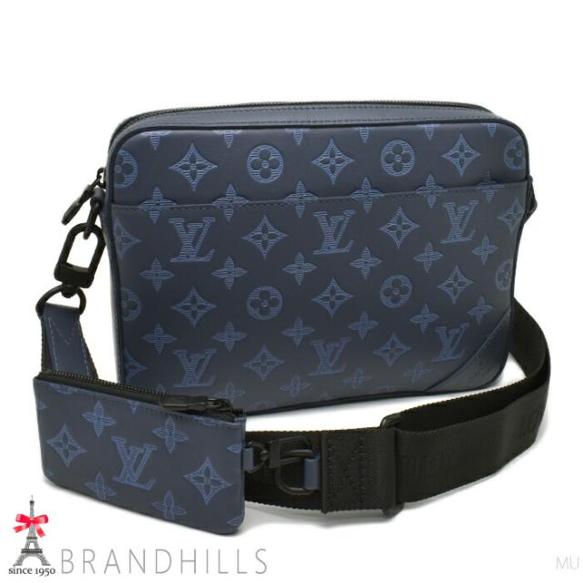 ネイビーブルーのモノグラムシャドウレザーをモダンなクロスボディバッグに仕立て、ストラップには取外し可能なコインパースを備えたバッグです。