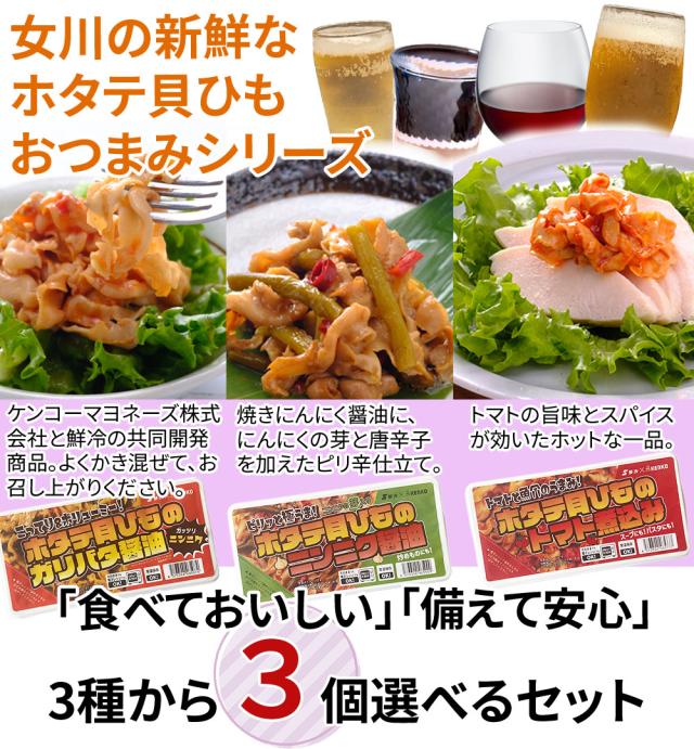 ホタテ貝の貝ひもを味付けしたおつまみです。3種から3個ご選択ください。