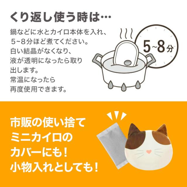 商品情報 | NECO ネコ カイロ2 くりかえし使えるねこ型カバーのカイロ。 カイロ本体の金属ボタンをパチっと押し曲げると液体が白く結晶化し発熱し、後はカバーに入れてぽかぽか暖かい。 カイロを繰り返し使う場合は、鍋に水とカイロを入れ5〜8分ほど煮ると白い結晶がなくなり透明な液体に戻るので、冷ましたら再び使う事ができます。 かわいいカバーは市販のミニカイロを入れたり、小物入れにしてもOKです。 <手のひらサイズでコンパクト!> コンパクトなので持ち運びにも便利! 冷える時のお供にオススメです。 |