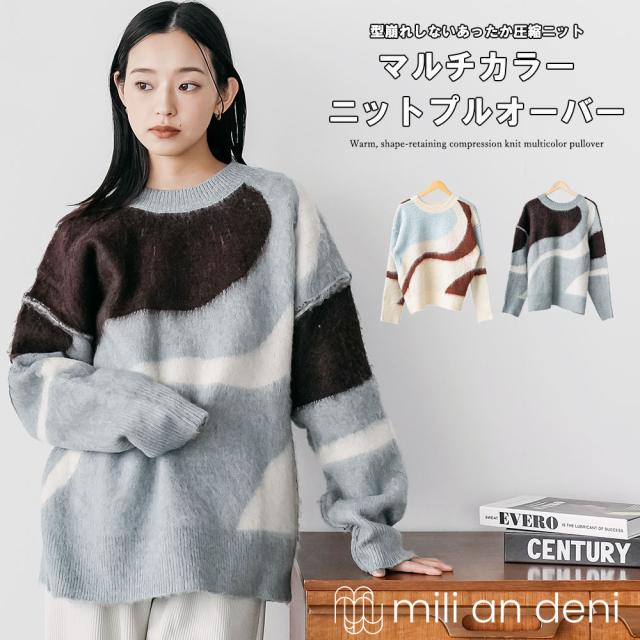 春新作 マルチカラー圧縮ニットプルオーバー ニット セーター クルーネック M トップス 春夏 レディース ミリアンデニ メール便(郵2) t61106