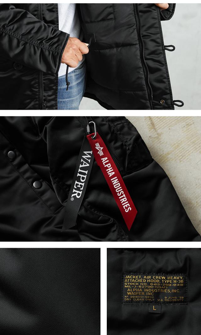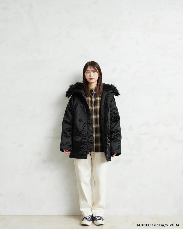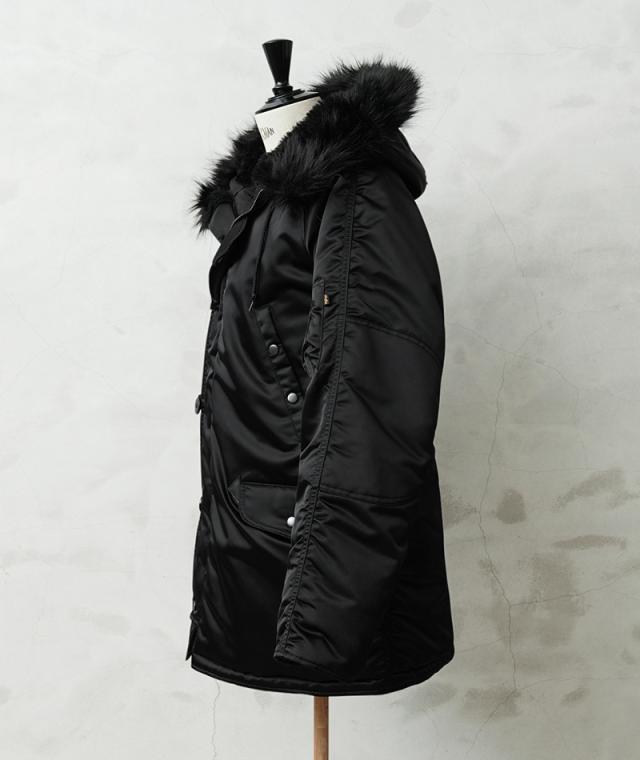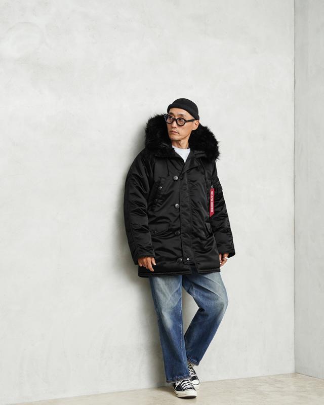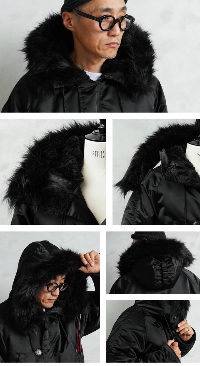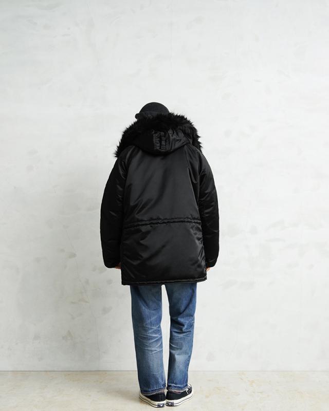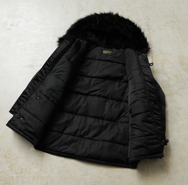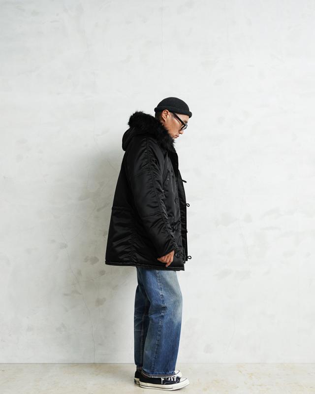 今回作成した別注N-3Bはディテールや存在感を踏襲しつつ、ファーも含めてオールブラックに仕上げることでオリジナルとはまた違ったシックで深みのある雰囲気を楽しめるデザイン。ボディの表地には、世界でもっとも古い歴史を持つ化学繊維“ナイロン66”ツイルを再現したファブリックを使用。