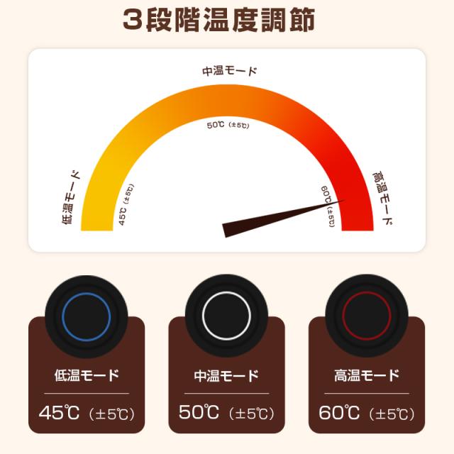 温度調節:3段階 高温(約60℃)、中温(約50℃)、低温(約45℃)