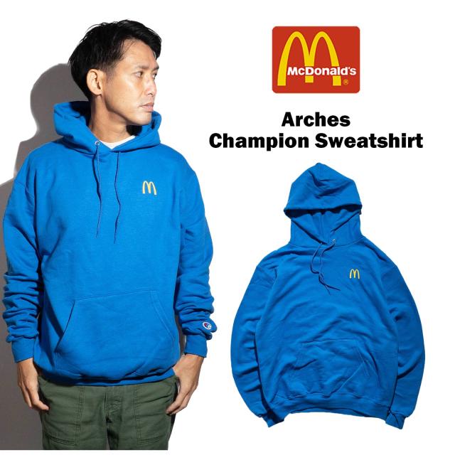 マクドナルド McDonald’s アーチロゴ チャンピオンボディ スウェットシャツ ブルー | メンズ S-XXL マック 公認グッズ 買い付け スーベニア パーカー フード