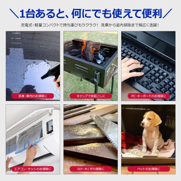 PCやキーボードなどの清掃、洗車時の細かな水滴の除去、車内のほこり飛ばし、エアコンフィルターやサッシの清掃、DIY・工場や現場での除塵など、幅広く活躍します。
