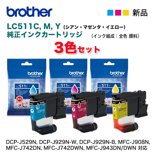 ※ネコポス便※【カラー3色セット】 brother/ブラザー工業 LC511C, M, Y (青・赤・黄) インクカートリッジ 純正品 新品 (DCP-J529N, DCP-J916N, DCP-J929N-W/B, MFC-J908N, MFC-J742DN/DWN, MFC-J943DN/DWN 対応) 【代引決済不可】