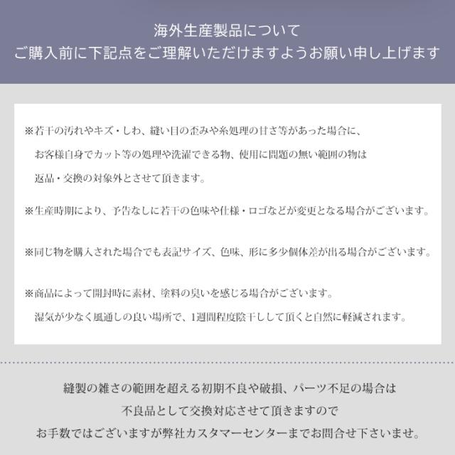 ■注意事項:商品の開封時に素材の臭いを感じる場合がございます。湿気が少なく風通しの良い場所で、一週間程度陰干しして頂くと自然に軽減されます。