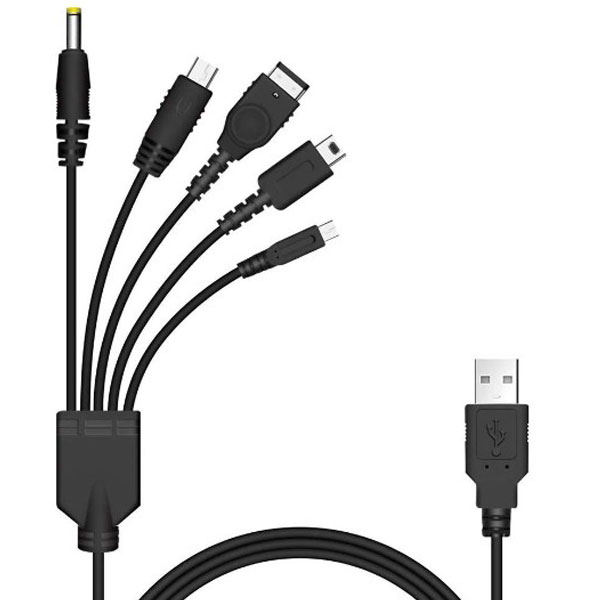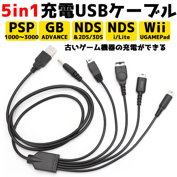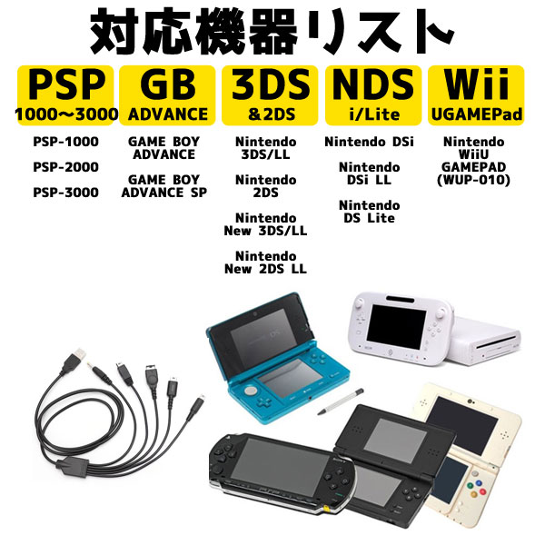[送料無料]古いゲーム機器の充電ができる! 5in1 各種ゲーム機器対応 USB充電ケーブル PlayStation Portable (PSP) Nintendo 3DS/2DS Nintendo DSi/Liteシリーズ(NDS/3DS等) Wii U GamePad (Wii U専用コントローラー)対応 マルチ充電 旧機器 任天堂 ソニー 復旧 修理 型落ち