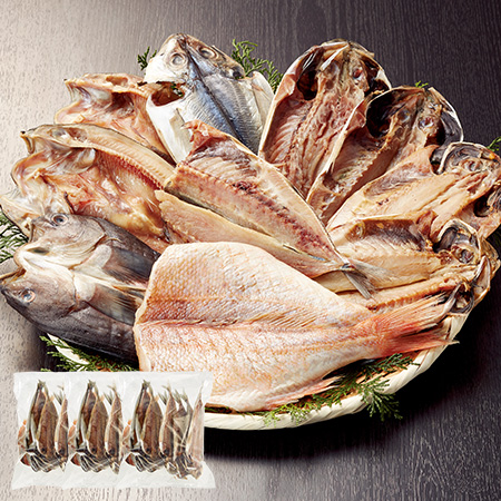 真あじ、あじ、金目鯛、さば、縞ほっけ、えぼ鯛、真ほっけ、いか、さんま、かます、いわし、赤魚、にしんなど13種類の魚の中から、