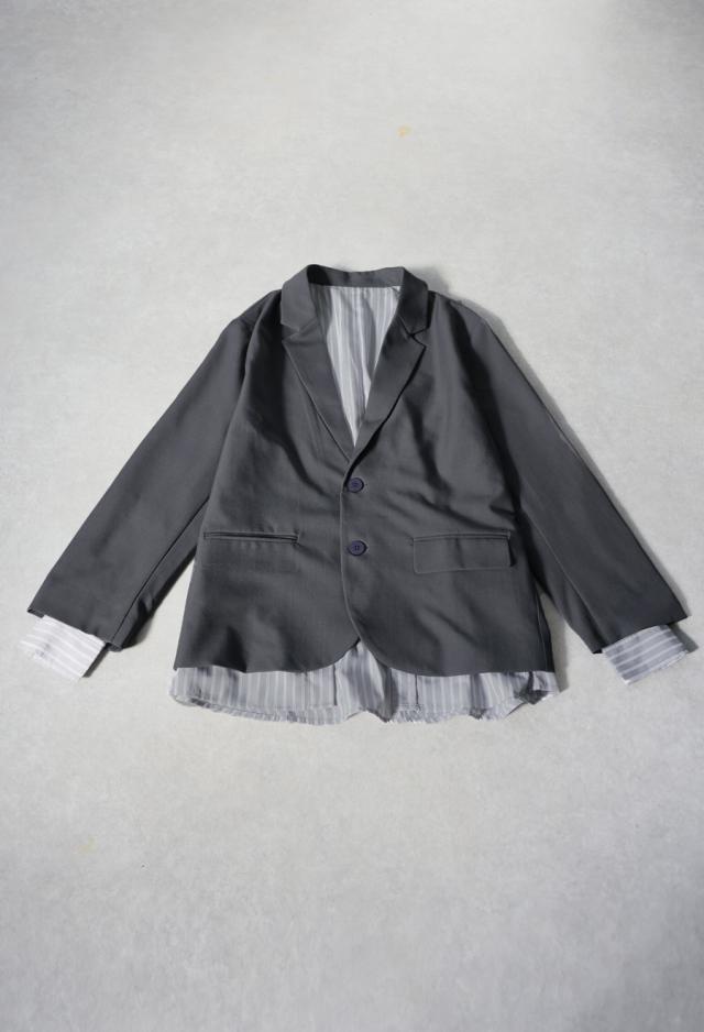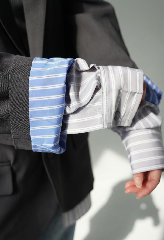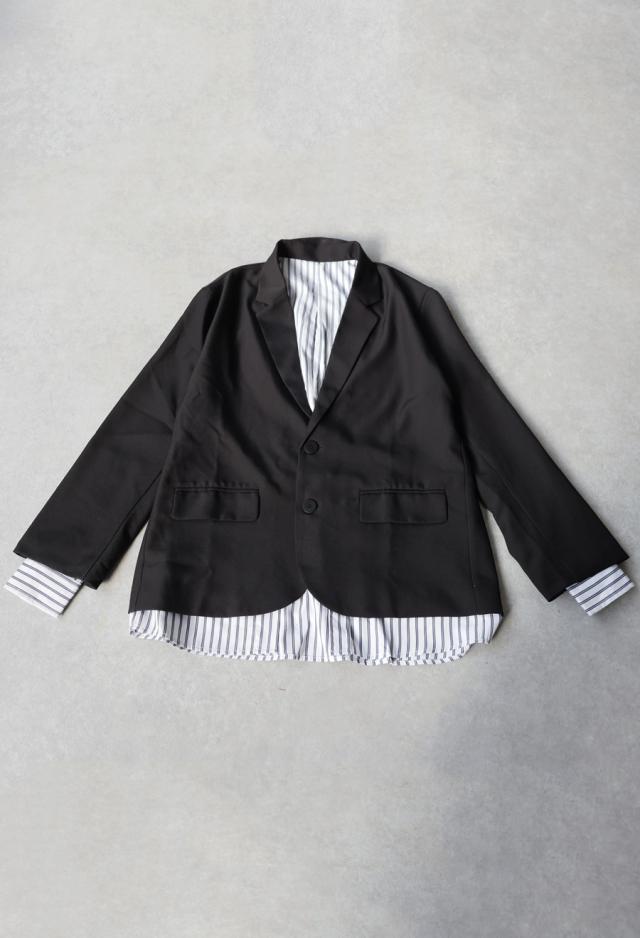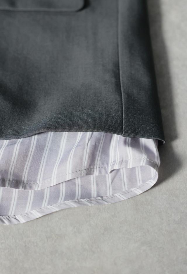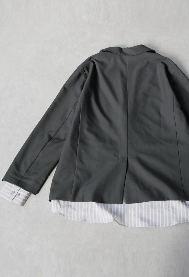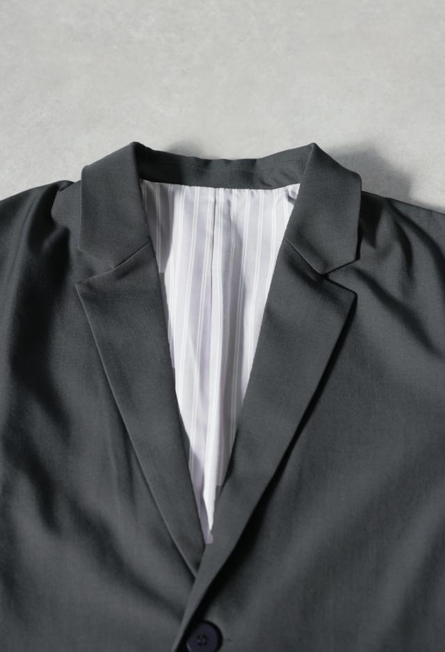 ベーシックなテーラードジャケットに、ストライプ柄のシャツを重ねたような切り替えデザインを取り入れ、個性とモード感を両立。