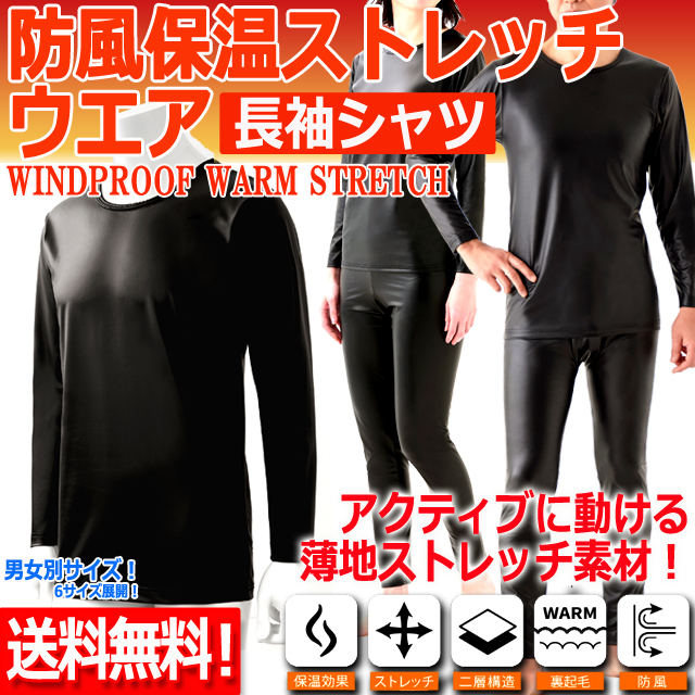 防風保温ストレッチウエア 長袖シャツ 送料無料 二層構造 裏起毛 薄着 デイリーウエア ワーキングマン アスリート アクティブ 体温 伸縮性 冷気