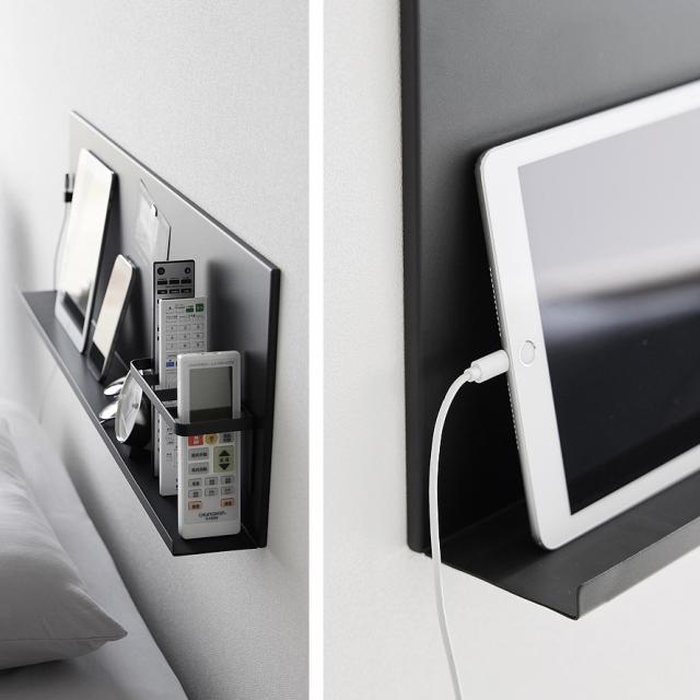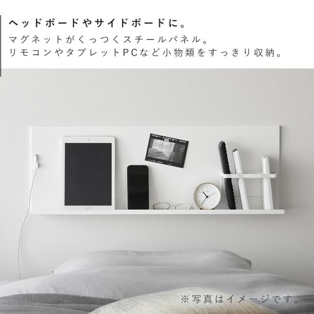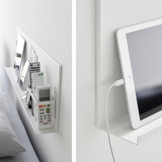 石こうボードピンで簡単に取り付けられる、リモコンホルダー付きスチールパネルです。ヘッドボードやサイドボードとしても便利に使え、リモコンやタブレットPCなどの小物を手の届く場所にスッキリ収納できます。