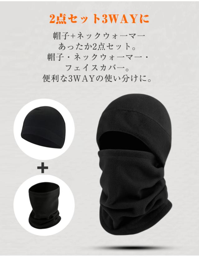 帽子+ネックウォ一マ一あったか2点セット。帽子・ネックウォ一マ一・フェイスカバ一。便利な3WAYの使い分けに。