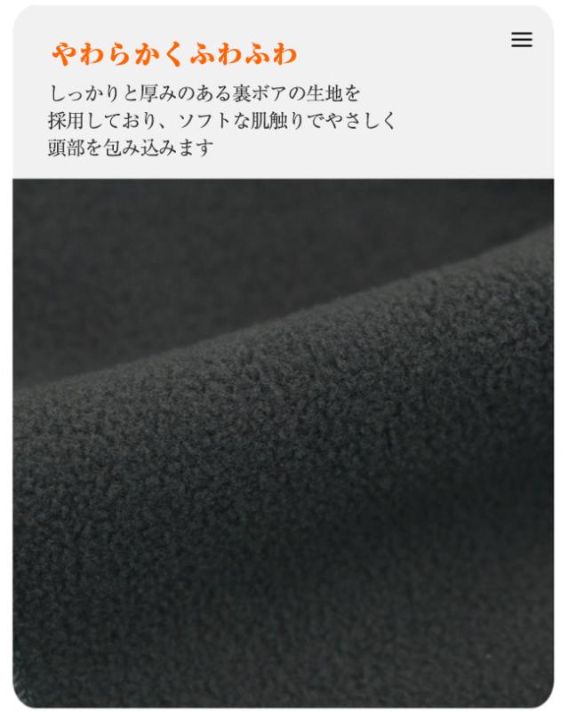 しっかりと厚みのある裏ボアの生地を採用しており、ソフトな肌触りでやさしく頭部を包み込みます