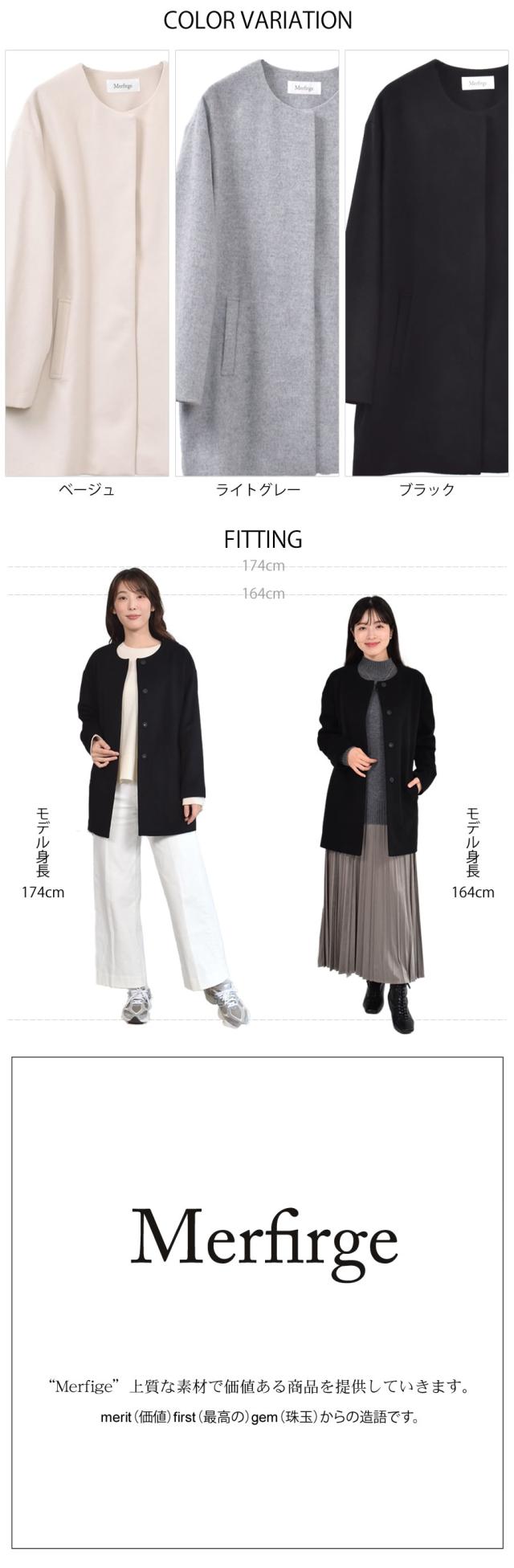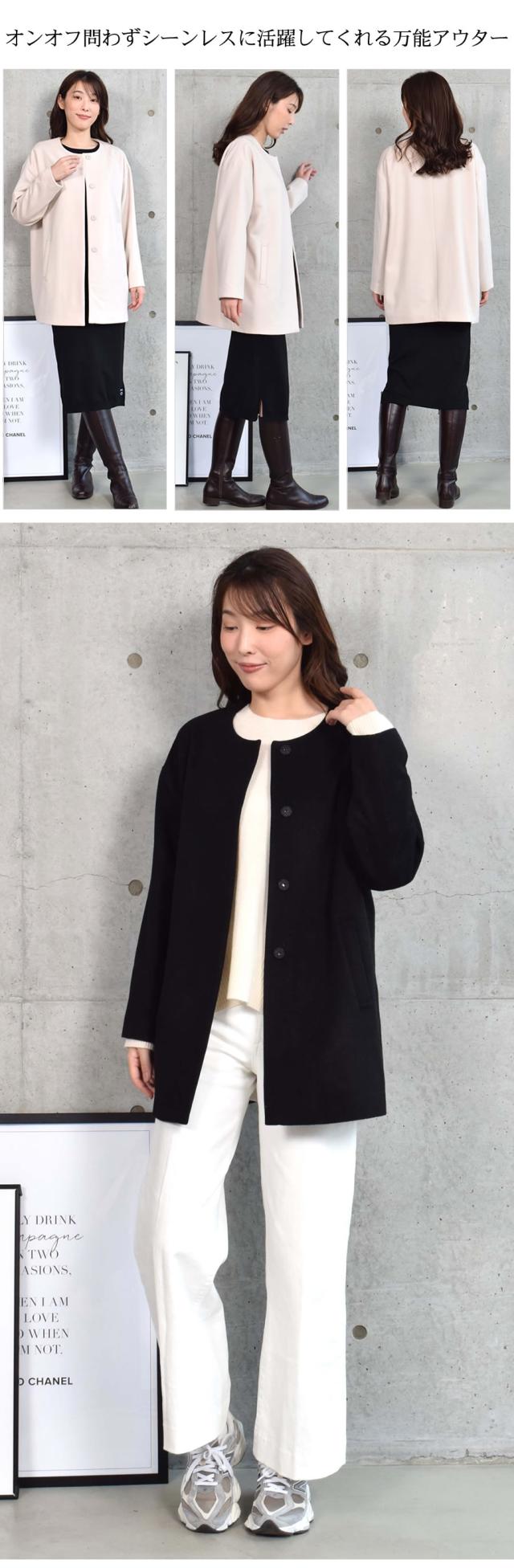 上品なウール100%素材を使用。上品な着こなしを叶える、大人のためのノーカラーコートは、顔周りをスッキリと見せてくれます。袖はドロップショルダーで、肩のラインが自然に落ちることで、ゆったりとした丸みのあるシルエットを生み出し、女性らしい柔らかな印象に見えます。羽織るだけでサマ見えするノーカラーコートは、タートルネックのニットとも相性が良く、ストールやマフラーなどの小物使いでコーデの幅が広がります。