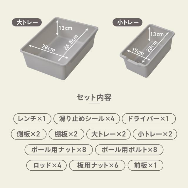 頑丈なトレー棚は1段あたり約10kgの耐荷重で、前後のポールがしっかり固定。