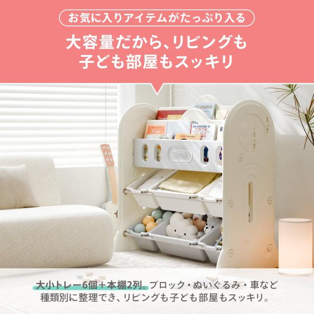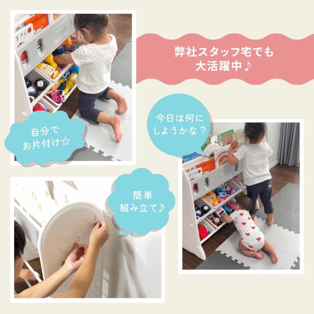 お子様の為の絵本&おもちゃラック。斜めトレーで取り出しやすく、落ちにくい。