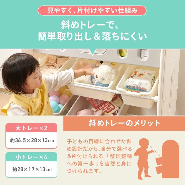 お子様の目線に合わせた斜めトレーは、中身が見やすく取り出しやすいため、