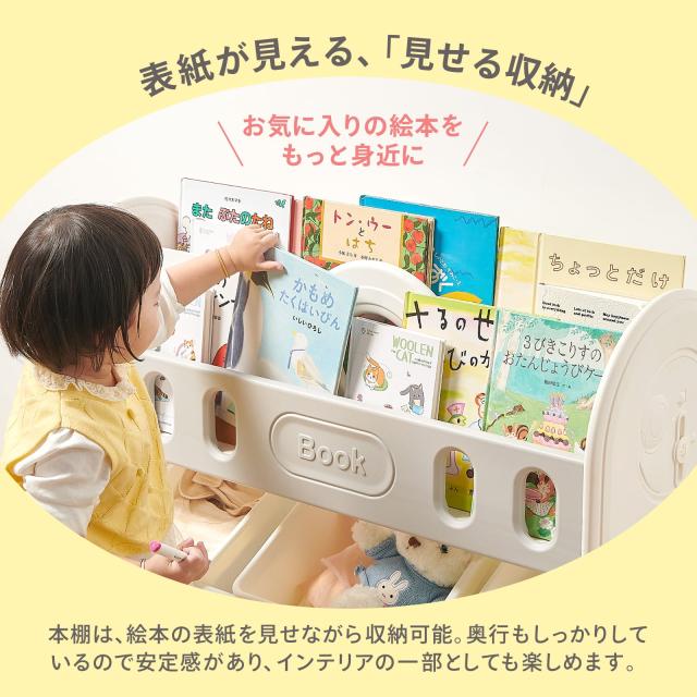本棚は表紙を見せる収納タイプで、お気に入りの絵本が一目で分かり、楽しく整理整頓ができます。