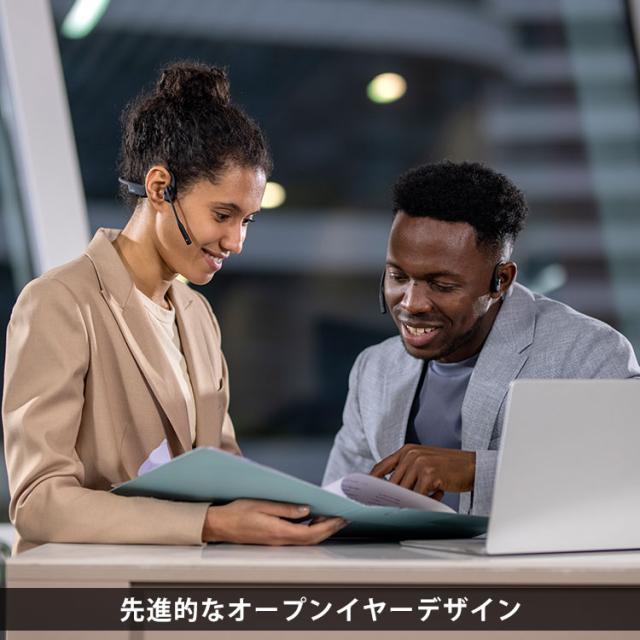 ●先進的なオープンイヤーデザイン 耳を覆い被せ、周囲とのつながりが遮断されてしまう従来のヘッドセットとは異なり、OpenComm2は、オープンイヤー設計により、快適さや音質を損なうことなく世界とのつながりが保たれます。 ●快適なつけ心地 ソフトなシリコン仕上げの柔軟なラップアラウンドフレームを備えたOpenComm2は、簡単かつ楽に、1日中着用できます。 ●明瞭な通話品質 デジタル信号処理(DSP)テクノロジーを備えたノイズキャンセリングマイク搭載により、気持ちの通じるコミュニケーションが実現します。クリアな音声での通話は、使用者の声を主役に引き立てるほどです。周囲のノイズをフィルタリングして除去することで「声」を識別、補正する (Clear Voice Capture CVC)テクノロジーにより、業務の開始時から終業まで高い忠実性を維持します。スリムで簡単に調整できるブームマイクを使用者に合わせて口元に配置することでマイクの精度を高めるとともに、使用しない時は後ろに折りたたんでおけば邪魔になりません。 ●卓越したオーディオ品質 第7世代の骨伝導テクノロジー PremiumPitchTM2.0により、重要な通話中に一言も聞き逃すことはありません。OpenComm2は、中音域および高音域の声を正確に集音しながら補正されるため、すべての単語を歪みなくはっきりと聞き取ることができます。 ●周囲とのつながりを遮断しない 自宅、オフィス、または外出先等で業務を進めるにあたって、多くの場合、周囲の状況や気配の認識が必要になります。OpenComm2のオープンイヤー設計により、周囲の状況とのつながりが維持されるため、隣からの声も聴き逃すことはありません。 ●自分の声が聴こえる安心感 オープンイヤーは通話中の自分の声の確認にも効果を発揮します。オフィス、コーヒーショップ、空港など、どこにいても、オーディオ制御を備えた高度なオープンイヤー設計によって、自分の声の大きさを常に認識できるため、周囲の人に迷惑をかけることもありません。 ●マルチポイント接続 ヘッドセットは、同時に最大2台のデバイスとペアリングできます。簡単な切り替え機能を利用して、途切れることのないスムーズな接続と作業効率の向上を実現します。 ●ユーザーフレンドリーな統合コントロール ヘッドセットの操作は統合されているため、ボタンを押すだけで、音量の調整、通話中のミュート/ミュート解除、オーディオの再生/一時停止、バッテリー残量の確認などが可能です。そのため、PCまたはモバイルデバイスからの操作をせずに、 よりシンプルな操作が実現できます。 ●長持ちバッテリーが作り出す途切れることのないコミュニケーション 長時間の使用が可能なバッテリーが搭載されています。これにより中断することのないコミュニケーションを行うことができ、いつでもどこでも通話に応答できます。 ●高度な防水性能 マイクにも防水用の音響メッシュを持たせることでIP55の防塵防水性を実現。水しぶきや軽い水濡れでも心配いりません。 |