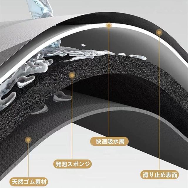 【高品質素材4層構造・踏み心地いい】技術合成繊維表面:水の快速浸透機能;最新型不織布層:優れた吸水性能+抗菌 防臭性能;発泡スポンジ層:柔軟快適な足触り;滑り止めゴム層:優れた滑り止め性能。もちもちクッション素材で、弾力感が足に心地よい、程よい厚みとクッション性で、ソフトな踏み心地。