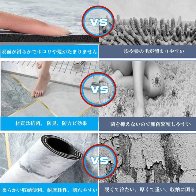 【冷たくない・ふんわり踏み心地】浴室マットの表面にはナノマイクロファイバーに利用して、従来の硬いマットと違って、冬にも冷たくない感じです。柔らかくて割れる心配がないし、吸い付くような踏み心地がいい。0.5cmの極薄タイプ+柔軟素材なので、用途に応じてお好きな形を自由にカットできます。