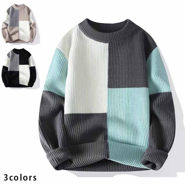 ニット セーター メンズ 厚手 防寒 カラーマッチング クルーネック カジュアル おおきいサイズ 冬服 メンズ 秋 冬 春