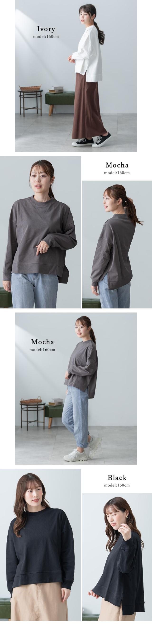 シルエットはゆったりめで、前後差のある丈感とスリット入りの裾が動きやすさと体型カバーを両立。