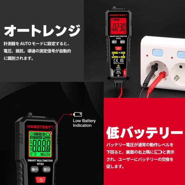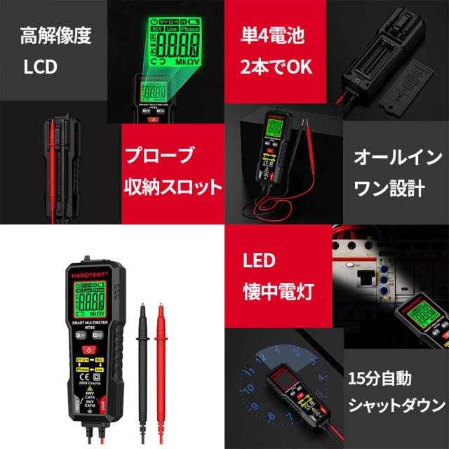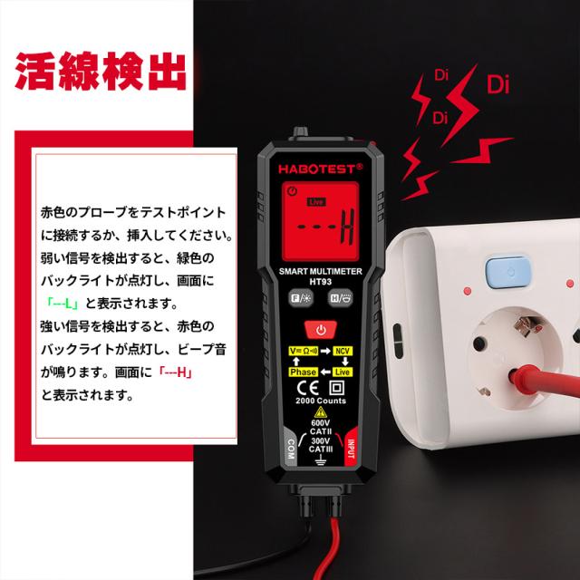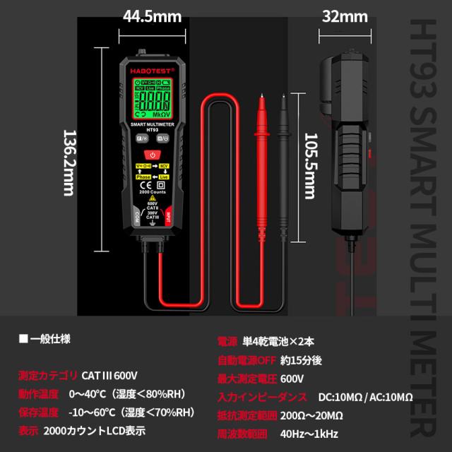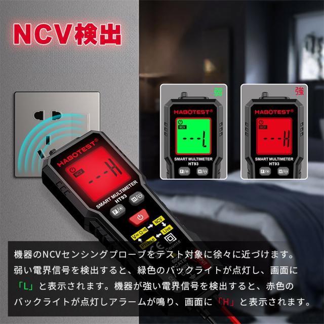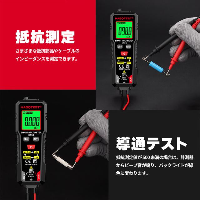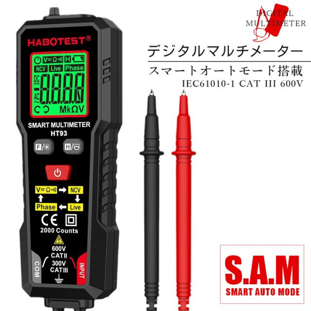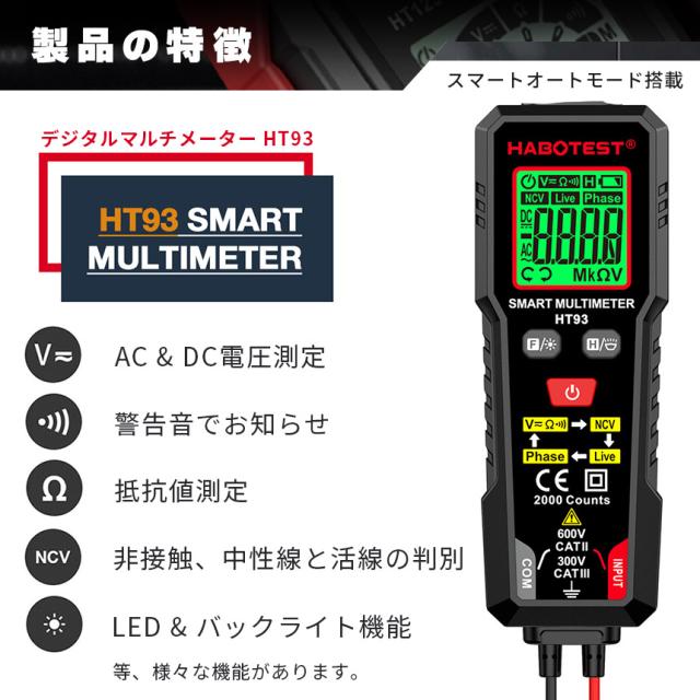 デジタルマルチメーター 高精度テスター AC DC電圧 抵抗 NCV 非接触電圧 検知 ライブ線判定 相順測定 自 バックライト付き 安全CAT3 600V対応 HT93 オート機 LED ライト機能 バックライト 通電チェッカー 通電確認 通電 電圧 測定器 簡単 日本語説明書付き