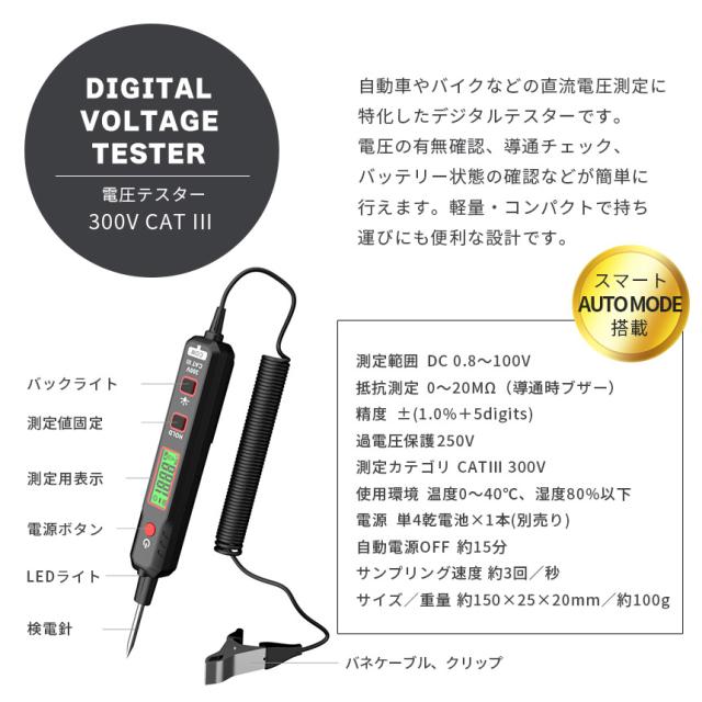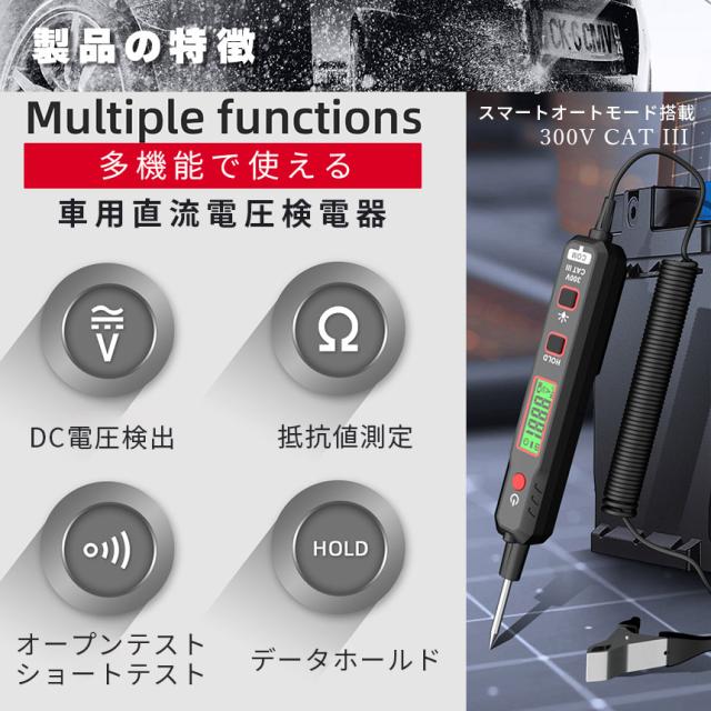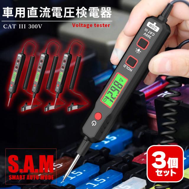 3個セット車用直流電圧検電器 DCテスター デジタル電圧計 LEDライト付き 導通テスト 自動レンジ 直流12V 24V対応 オートテスター バッテリー診断 安全CAT3 300V対応 軽量コンパクト 電圧 測定器 簡単 日本語説明書付き 自動車 トラック バイク 二輪