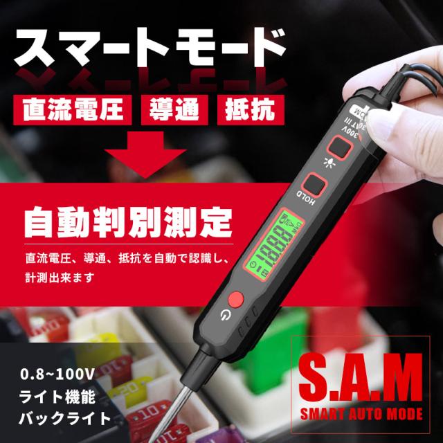DC電圧測定対応(0.8〜100V):12V・24V車のバッテリーや配線確認に最適。