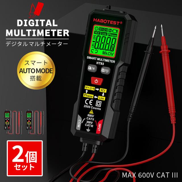 2個セットデジタルマルチメーター 高精度テスター AC DC電圧 抵抗 NCV 非接触電圧 検知 ライブ線判定 相順測定 自 バックライト付き 安全CAT3 600V対応 HT93 オート機 LED ライト機能 バックライト 通電チェッカー 通電確認 通電 電圧 測定器 簡単 日本語説明書付き