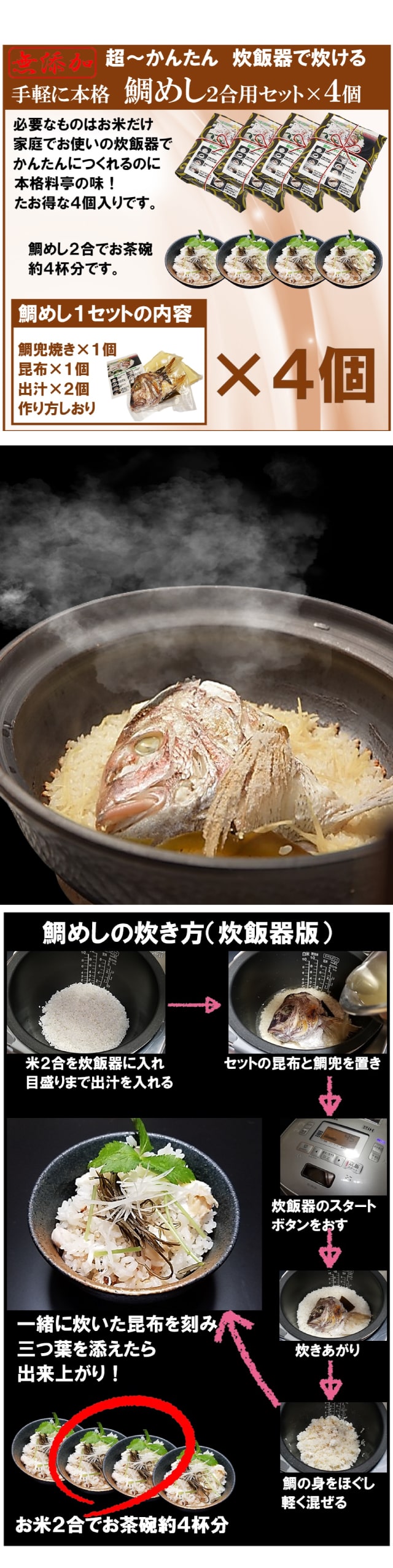 このセットでは、2合分(お茶碗4杯分)が4個入っており、家族や友人と共に贅沢な鯛めしを楽しむことができます。