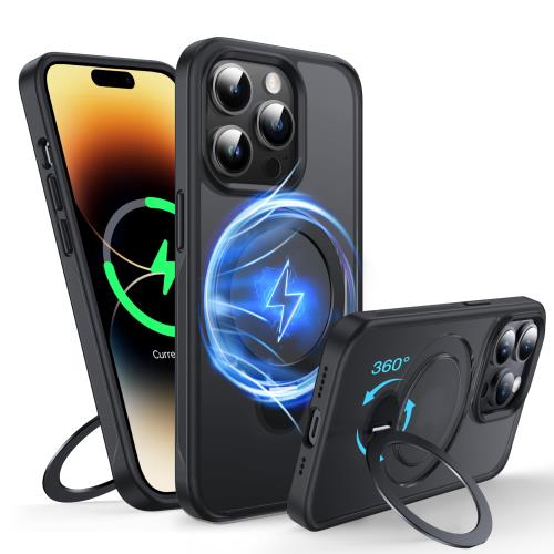 FNDMIL360°回転・MagSafe対応iPhone 14 Pro 用 ケース [目に見えないスタンド] [滑り止めテクスチャ] 米軍MIL規格 シリコン付き 半透明マットハードカバー アイフォン14 Pro 用 ケース マグセーフ対応 ワイヤレス充電対応 薄型 (ブラック)